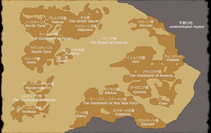 Other regions of the world include Yerles, Eulderna, Zanan, Vindale Forest, and South Tyris. Yerles and Eulderna are at war, with North Tyris often being caught in the crossfire. Zanan and the Elea of Vindale Forest are also at war, with rumors saying that the Vindale Forests are the source of the Etherwind. According to dialogue with NPC's, there once was an eastern nation called Karune, which was devastated and brought to ruin by the Ether Disease.